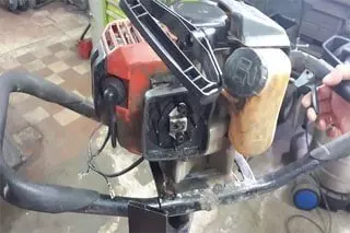 У мотобура оторвали все, что возможно оторвать - кожух глушителя, кнопку зажигания, корпус воздушного фильтра и сам воздушный фильтр. По внешнему виду кажется мотобуром не только бурили землю, но и размешивали цемент, забивали гвозди, ломали бетон... Тем не менее мотобур жив, двигатель запускается и работает. Мотобур надежный без сомнения.